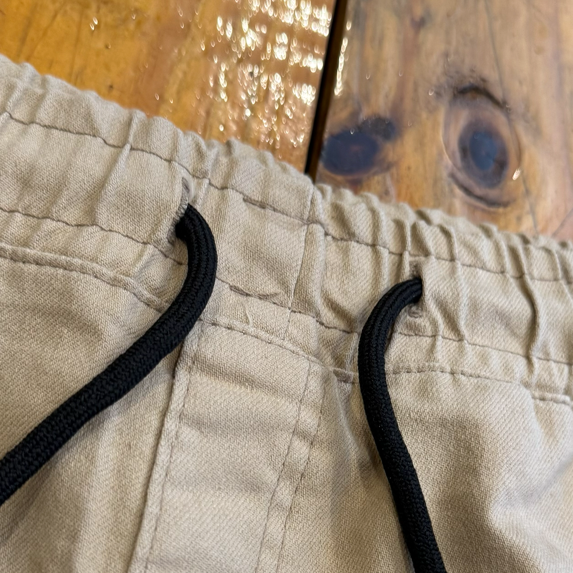 Cós com elástico e cordão de ajuste.