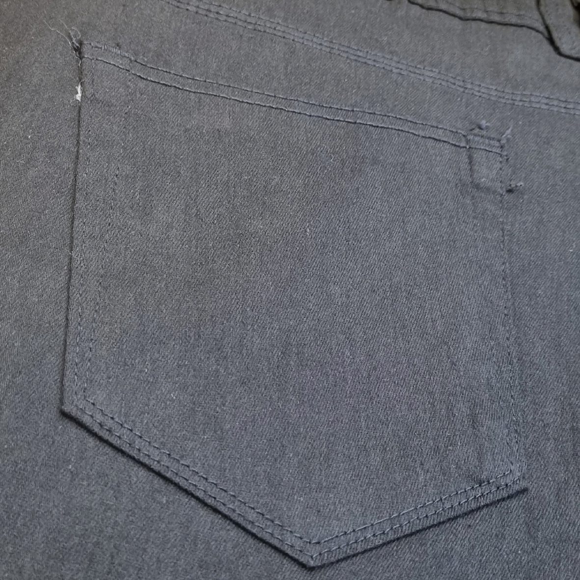 Possui cós com passantes, fechamento em botão e zíper, além de bolsos funcionais.