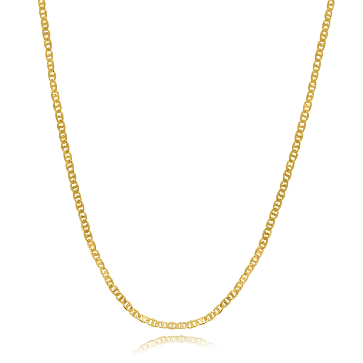 Corrente dourada com elos finos e uniformes, oferecendo um visual elegante e discreto. Seu brilho sutil valoriza qualquer combinação, sendo perfeita para uso diário ou em ocasiões especiais. Um acessório clássico que nunca sai de moda.