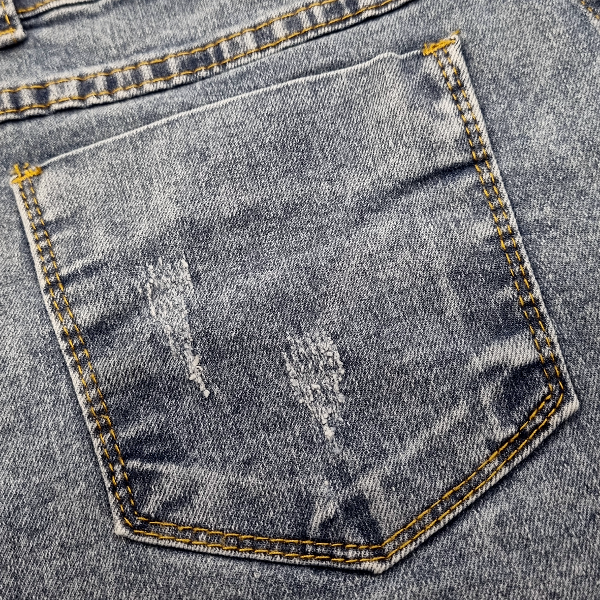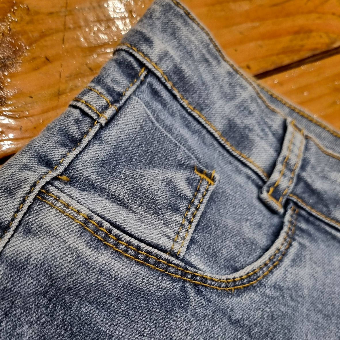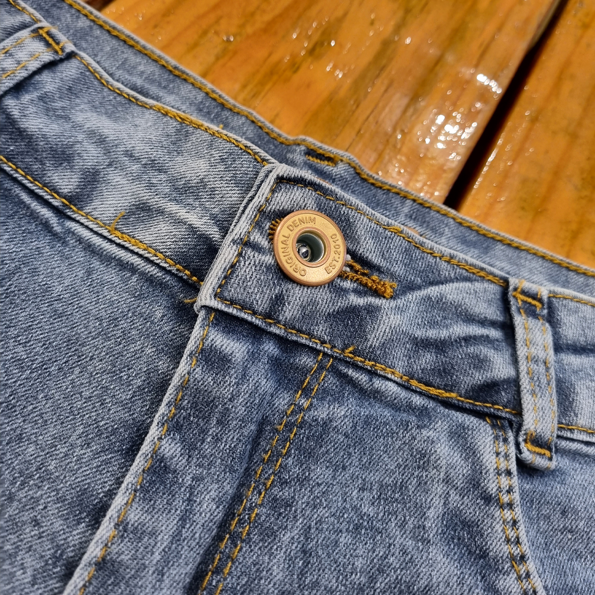 Possui leves detalhes desgastados e barra dobrada, deixando o visual moderno e despojado.
