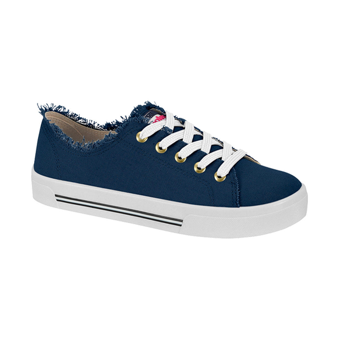 Seu design moderno conta com acabamento desfiado e cadarços brancos, que criam um contraste cheio de personalidade. As ilhas douradas e o solado branco com listras laterais reforçam o visual casual, perfeito para o dia a dia. Leve, versátil e fácil de combinar, é ideal para quem busca praticidade sem abrir mão de um look cheio de charme.